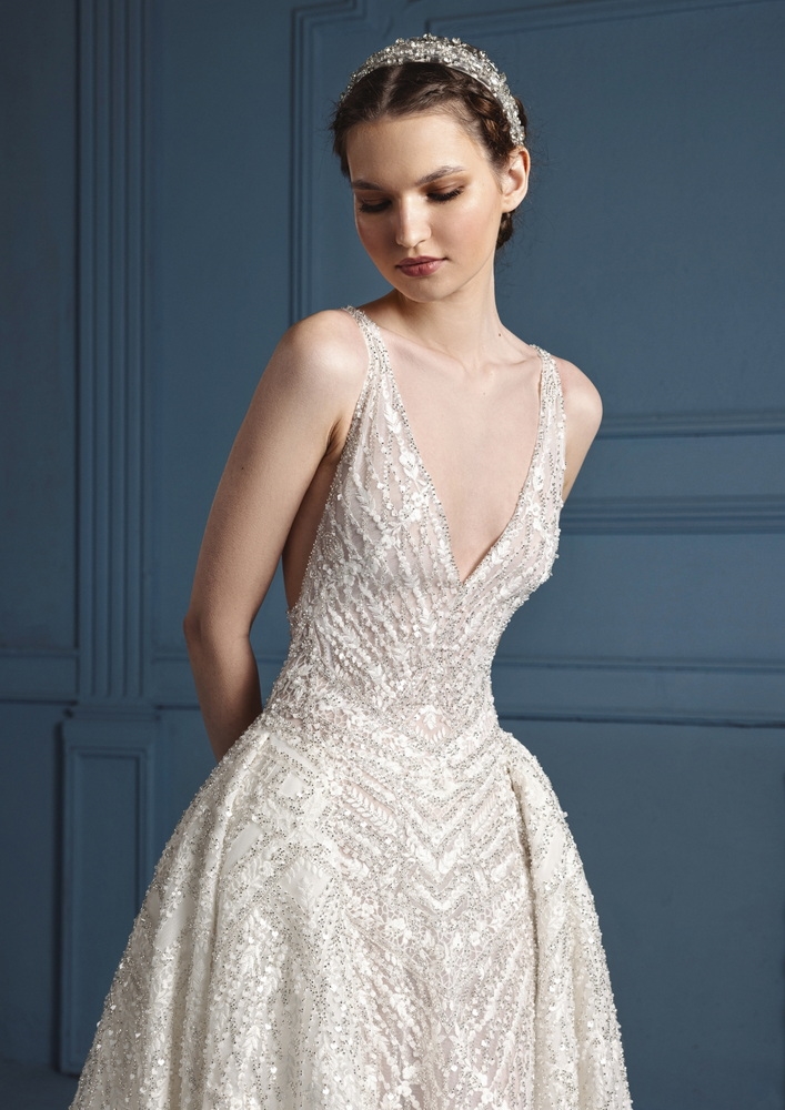 Classic with a twist! Beaded tulle gown featuring a V-neckline and fitted skirt; A sweeping embroidered overskirt adds dimension and structure to the refined silhouette.