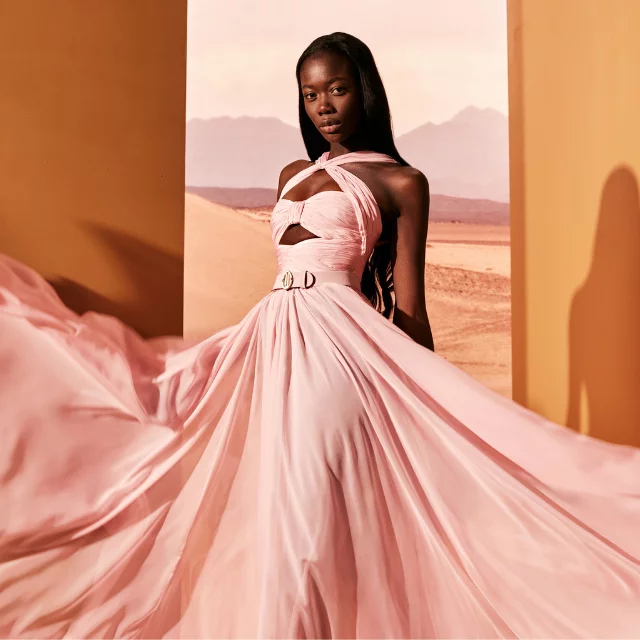 In the midst of these rare fauna and flora, we spot interesting volumes and shapes on the wind-driven sand with oversized hats. Sculptural forms with clinched waist, flattering cargo silk pants mixed with sheer shirts, kimono-like midi-dresses with oversized pockets, wild animal prints and palm trees, craftsmanship of shimmers sparkling the vast space. It was a whole troupe navigating in an interesting color palette, contrasting the dryness in Rubin red, pink quartz, blue serenity, water green… with a touch of camel harmonizing the surrounding, yet standing out from it. It’s the Tony Ward Ready-to-Wear Fall Winter 2024/25 collection.